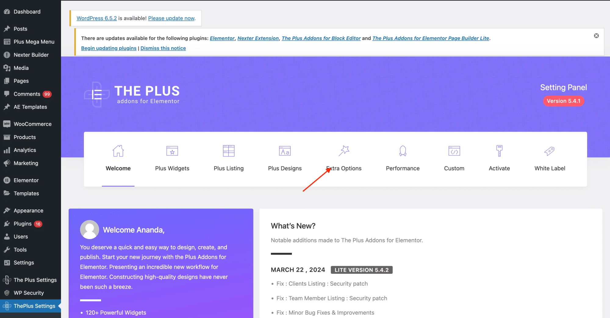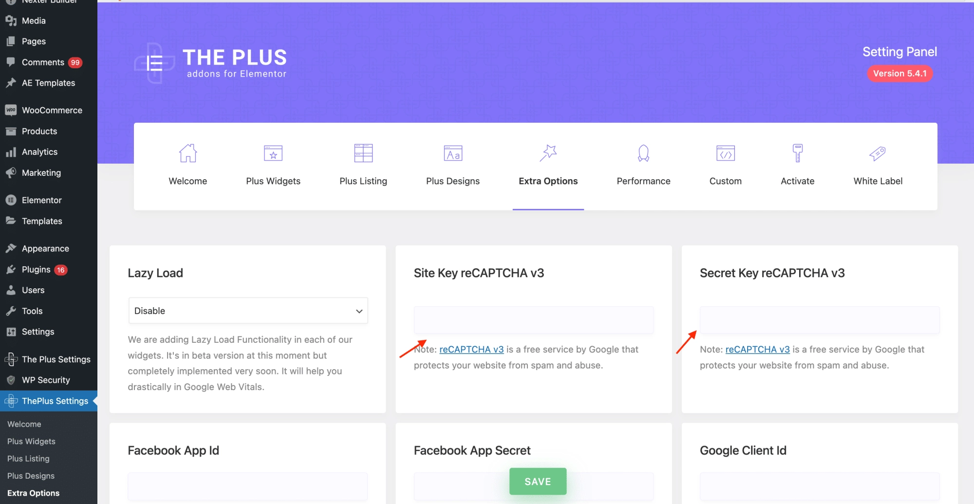 To activate reCAPTCHA, navigate back to your WordPress dashboard. Go to The Plus Settings > Extra Options.