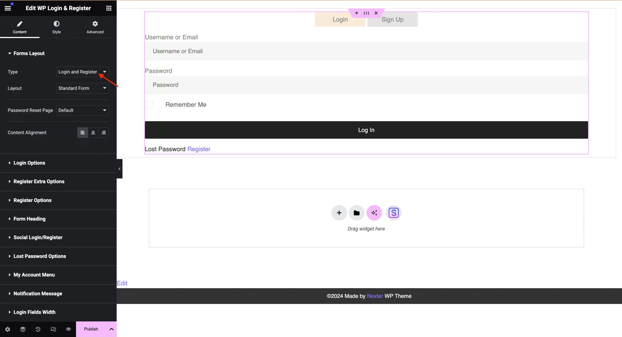 In the widget settings panel, set the Form Layout Type to ‘Login and Register.’ This allows the widget to handle both login and registration requests.